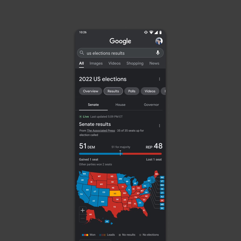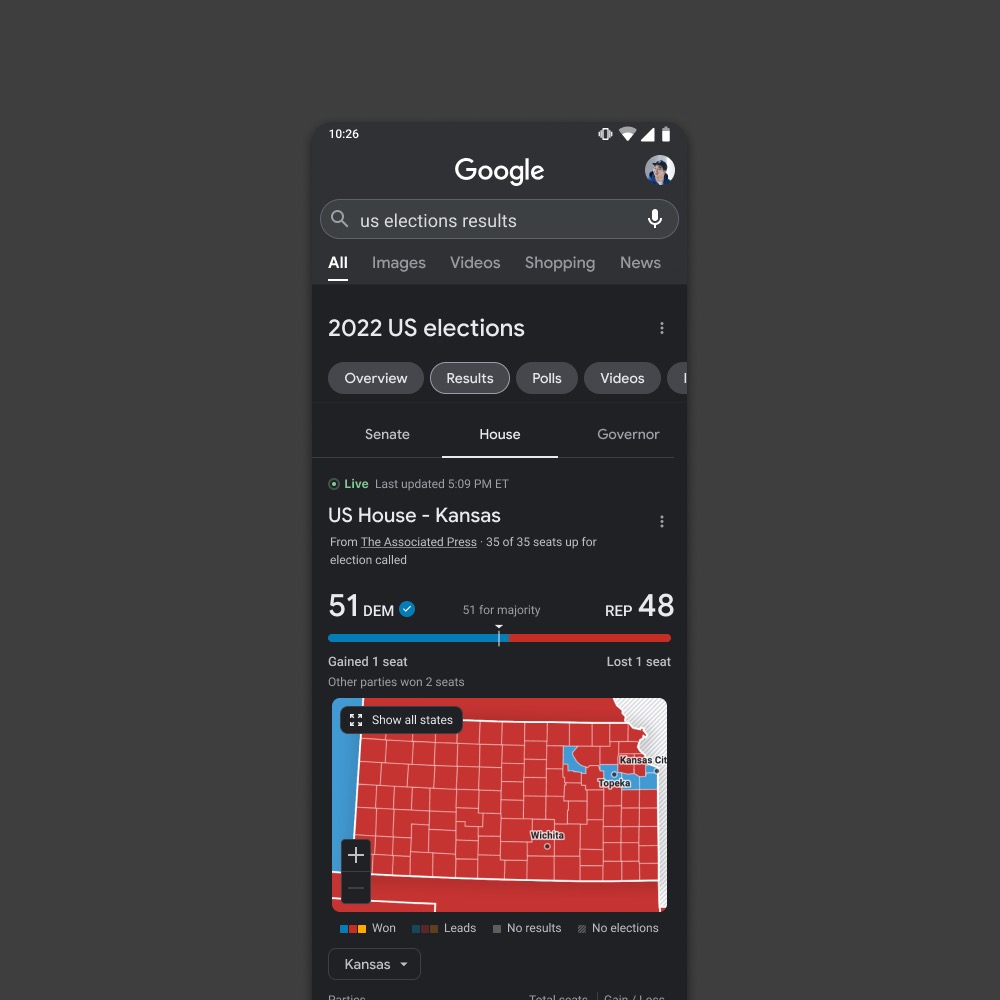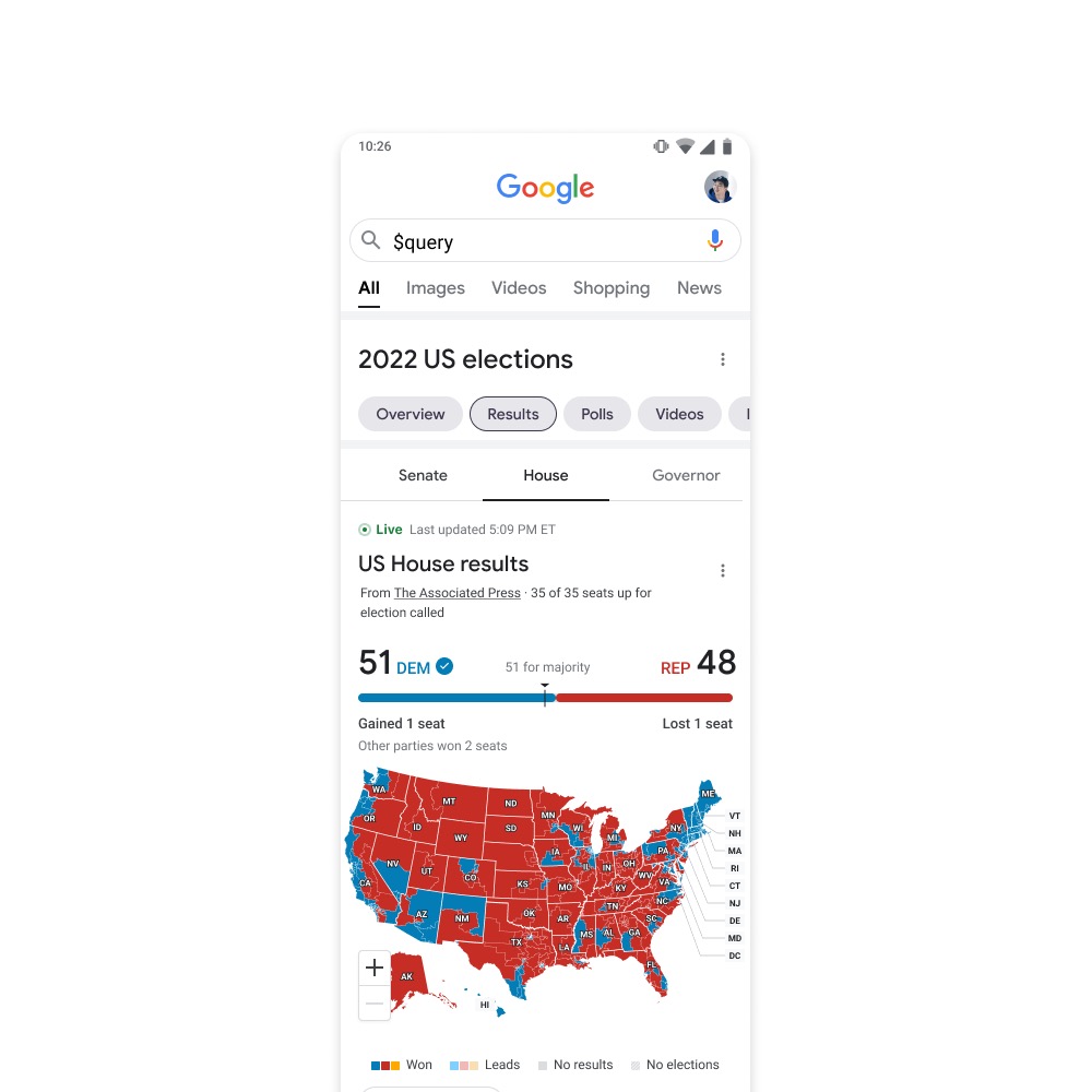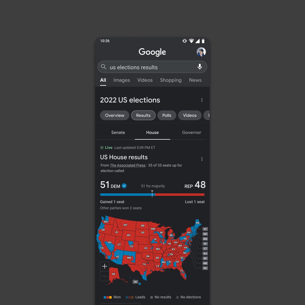 Following the 2021 redistricting process, we were tasked with updating the U.S. map for the upcoming midterm elections. Google required us to increase the map's detail while maintaining a file size under 200kb for optimal performance. Leveraging an internal resource tracking the latest redistricting developments, we strategically prioritized highlighting states with finalized district borders. This approach allowed us to showcase the progress while acknowledging the ongoing process in more contentious states.