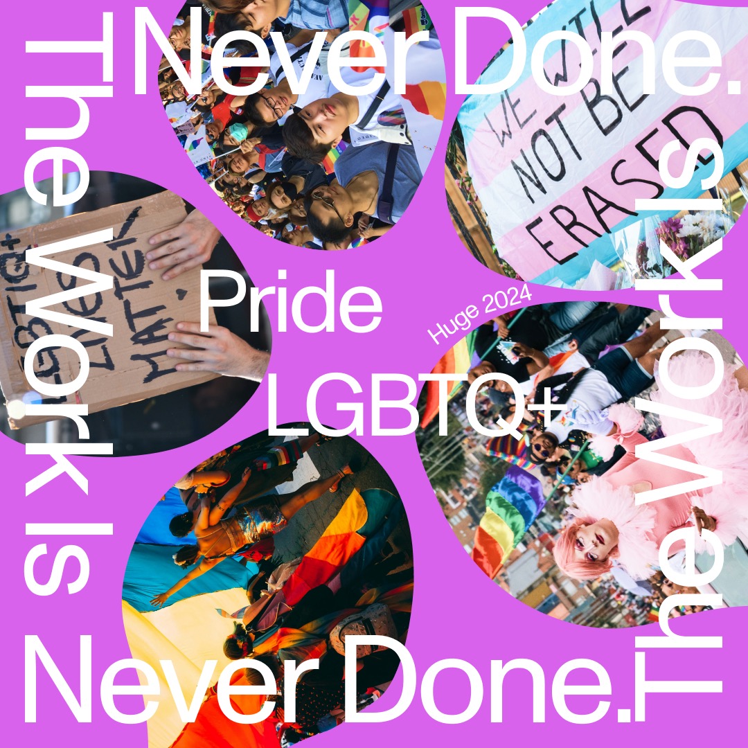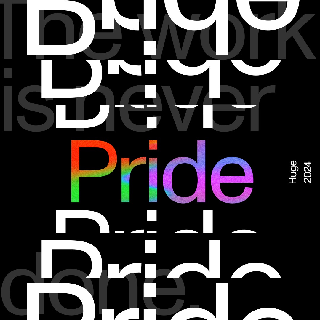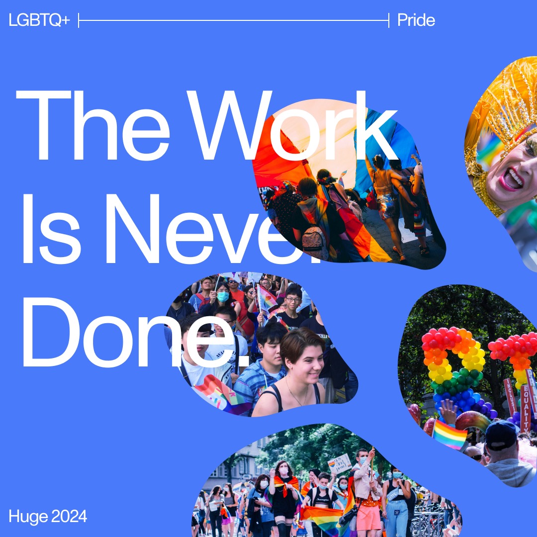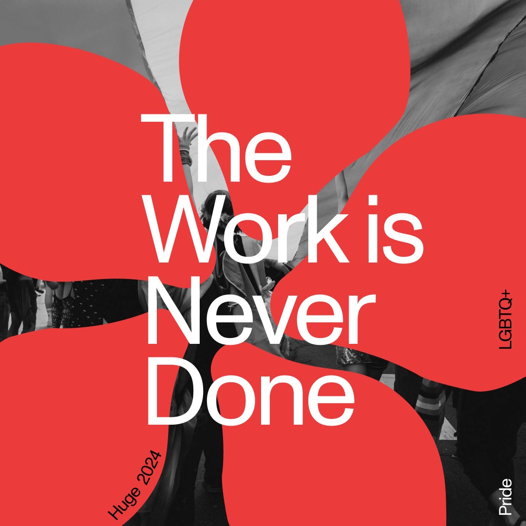 As Pride Month approached, the challenge was to create impactful content for Huge's social media and internal communications channels. Inspired by the DE&I team's 2024 slogan, "The work is never done," I aimed to develop assets that resonated with the LGBTQ+ community's history of ongoing struggle and resilience.